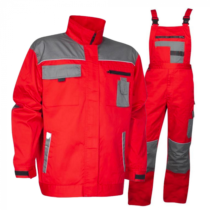 Costum de lucru roșu cu pantaloni cu pieptar, Ardon 2STRONG – oferă protecție, confort și vizibilitate sporită pentru o varietate de medii de lucru. Include o jachetă de lucru robustă și pantaloni salopetă comozi, ambele confecționate din materiale de înaltă calitate.